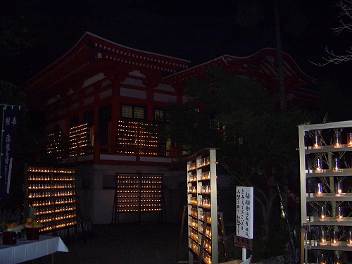 迎え万灯会法要とは、境内や鐘つき堂までの山道に一万灯のローソクを灯し、水子さんとご先祖様を慰霊するものでございます。龍王院では夏の風物詩として県内外の皆様に観ていただこうと毎年8月の第1日曜日に行っております。一万灯の灯は、夕方から深夜にかけて灯しておりますのでお気軽にご参拝下さい。