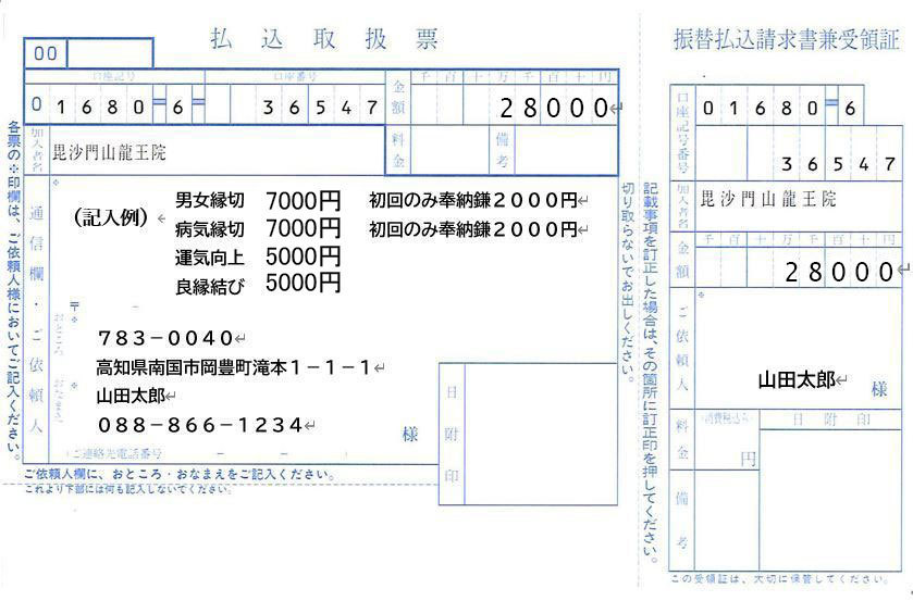 祈願料 7,000円(お札 、祈願ローソク付き)初回のみ縁切り鎌奉納は2,000円別途必要