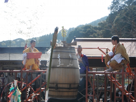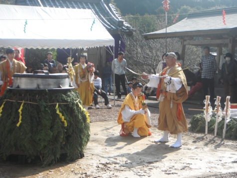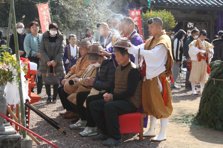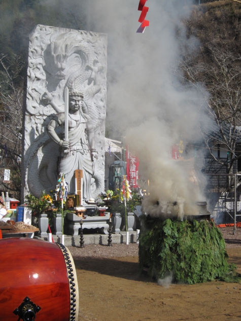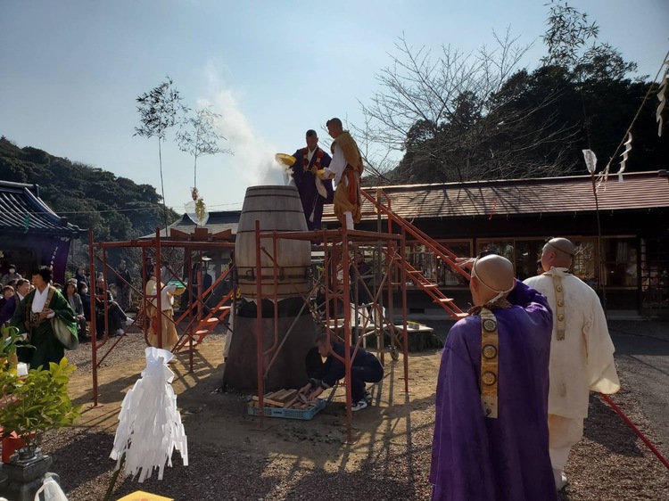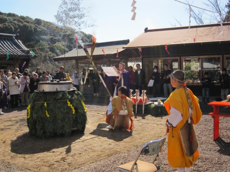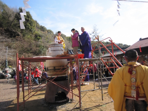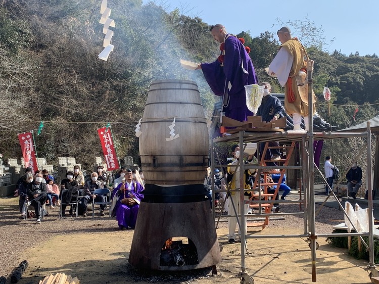 皆様からお申し込みの願い事を書いた護摩木を釜に供えて釜の浄水を沸かしてその後桶を組み浄米を入れて祈願し浄音を発して願い事を佛天に届けるものです。その浄米を持ち帰り敷地や田畑に撒いたりご家族で食して無病息災を願います。最後に御本尊毘沙門天様の福をお分けする意味で福豆撒きや福餅まきや福引を行いました。皆様の一年の安泰をお祈りいたします。合掌